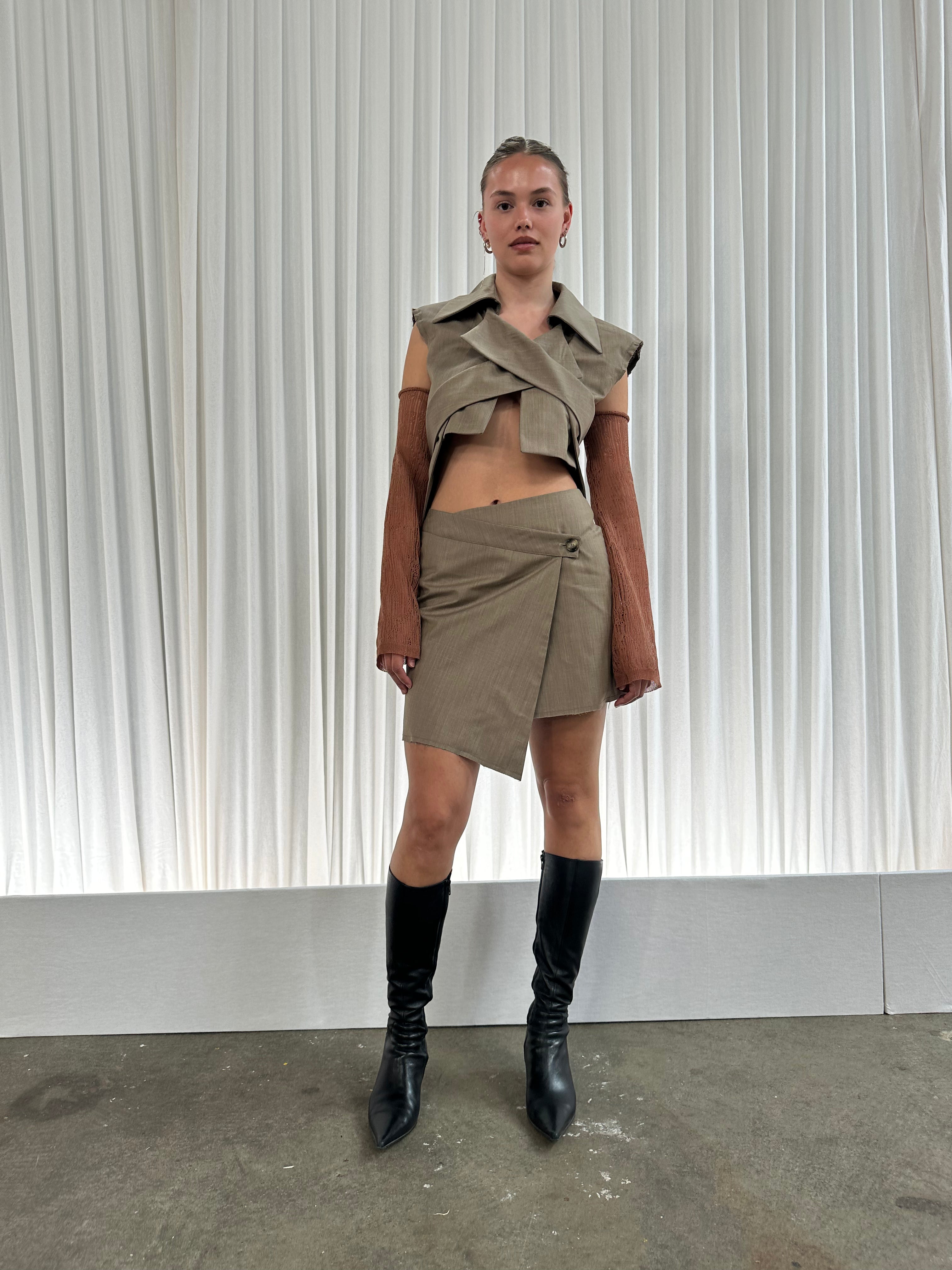 First and foremost, I drew inspiration from vintage military jackets and trench coats, which to me exude authority and presence! As a contrast, I wanted to make the top sexy in a delicate way, aligning with my design universe by featuring an open back. The cords symbolize being caught between control and losing control, adding a playful element where you can "buckle up" 💥🥊