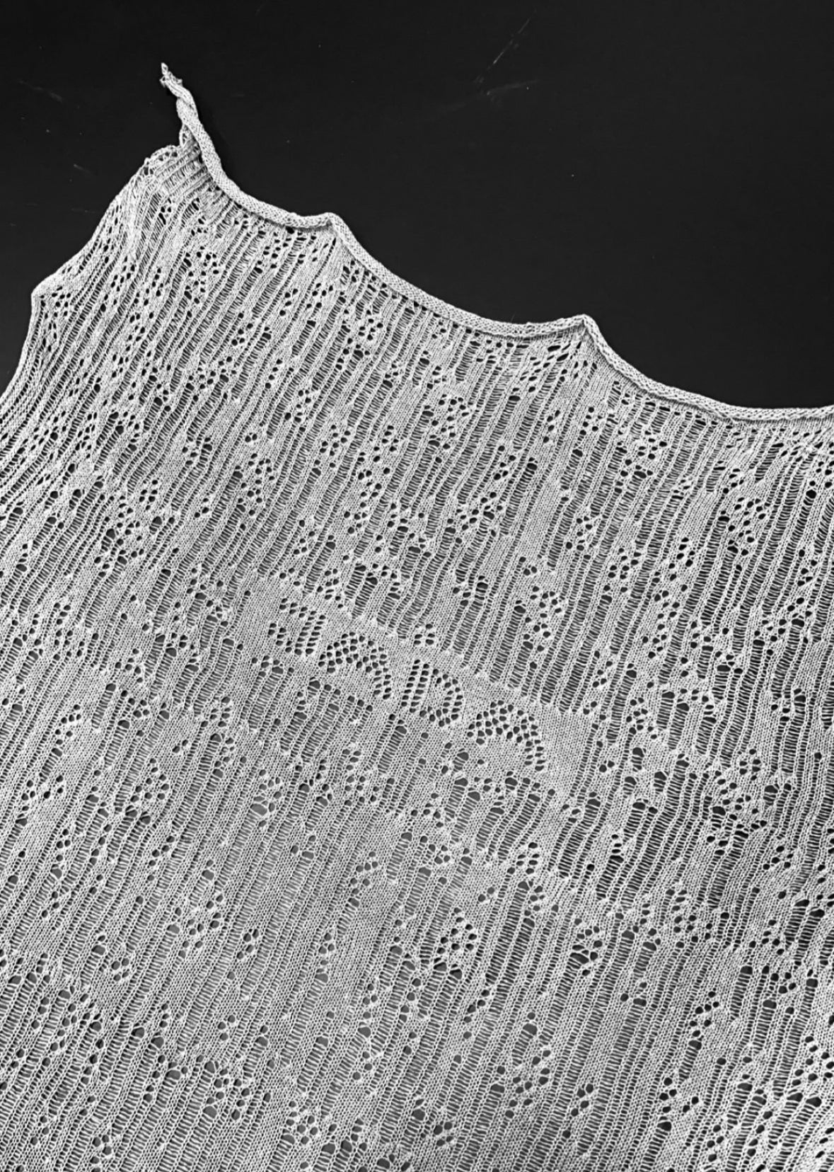 The sweater's base design is challenged by my unconventional approach to cuts. The standard side seam has been removed and replaced with an asymmetrical placement on the front and back. This asymmetry is further emphasized through panels of varying lengths, with one sleeve also reflecting this imbalance. The sweater’s tactile surface is inspired by the plants found in my grandparents’ garden, creating a texture reminiscent of branching patterns 🌿