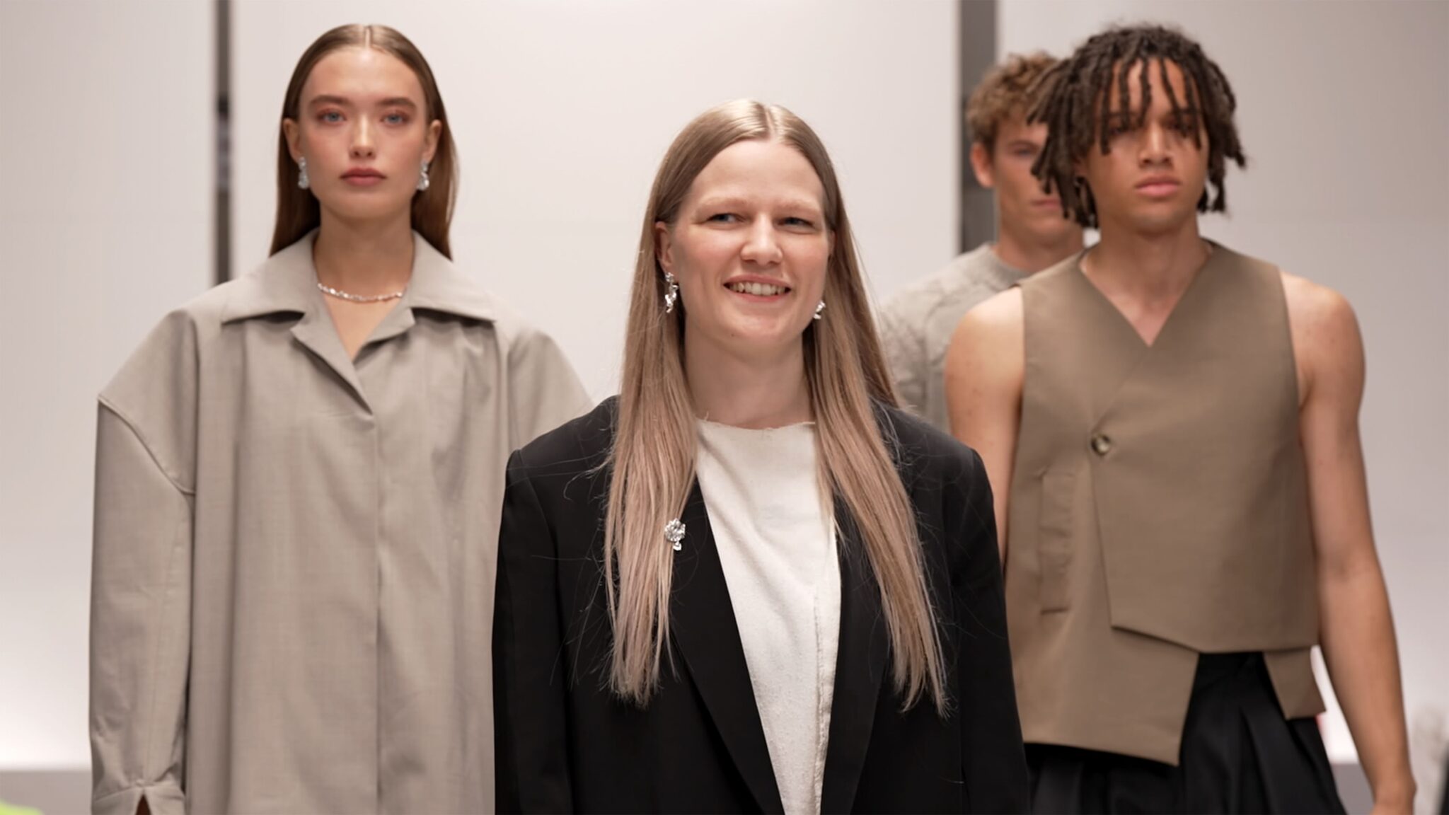 "I’m newly graduated, so I haven’t yet had the chance to establish everything related to production,” says Anne-Kathrine Bech Rønn as she presents her collection to buyers from Boozt, Storm, Magasin, and Mads Nørgaard in the finale of Danmarks Næste Tøjdesigner.